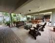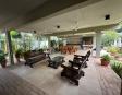Living diario al aire libre con ventiladores de techo.