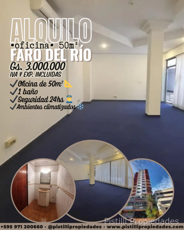 ¡ALQUILO OFICINA CENTRO DE ASUNCIÓN EDIFICIO FARO DEL RÍO! Trabajá con la mejor vista y ubicación del centro! con una ubicación estratégica cerca de Aduana, Puerto, entidades estatales, bancos.