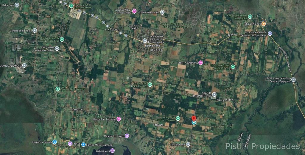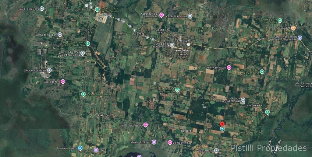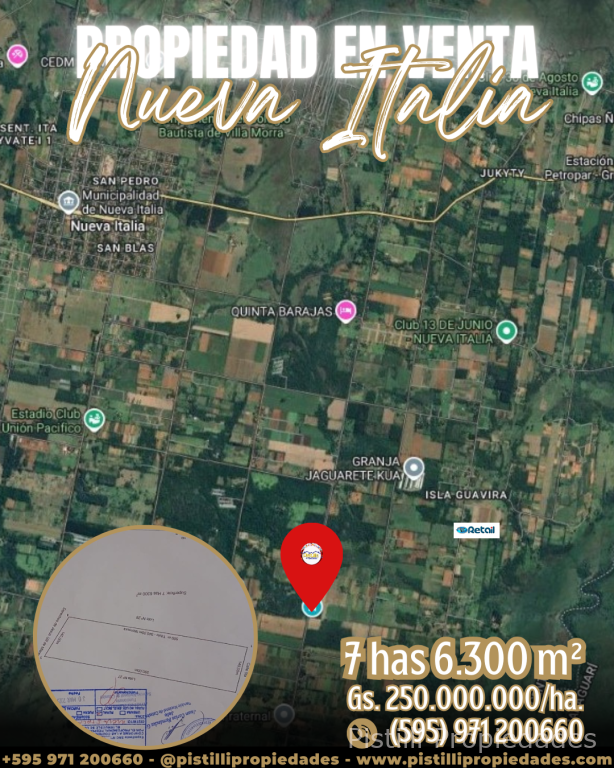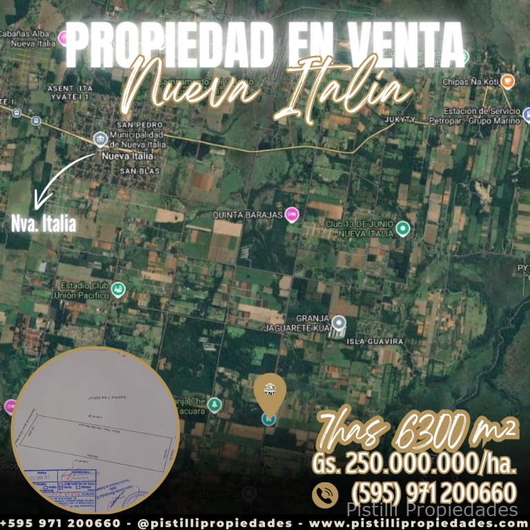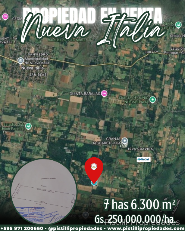 PROPIEDAD DE 7 Has. 6.300m² NUEVA ITALIA sobre ruta asfaltada, a 5min. de centro de la ciudad. A 2km de la ruta a Carapegua y a 20 min. de Itá y Acceso Sur. USF cancha de fútbol, capilla y escuela cerca. Varios accesos asfaltados.