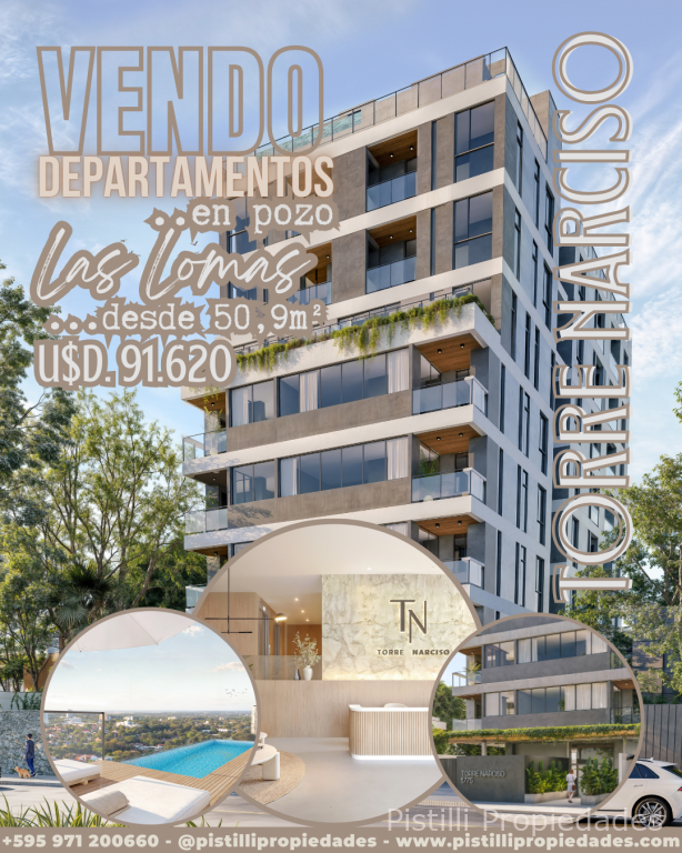DEPARTAMENTOS EN POZO LAS LOMAS "TORRE NARCISO" Edificio boutique diseñado para ofrecer una experiencia de vida de vanguardia. Se destaca por sus comodidades modernas y su ubicación privilegiada. Situado en una zona de alto crecimiento en Asunción. Cercano al Shopping del Sol y Paseo La Galería, así como a una variedad de servicios comerciales, restaurantes y parques.
