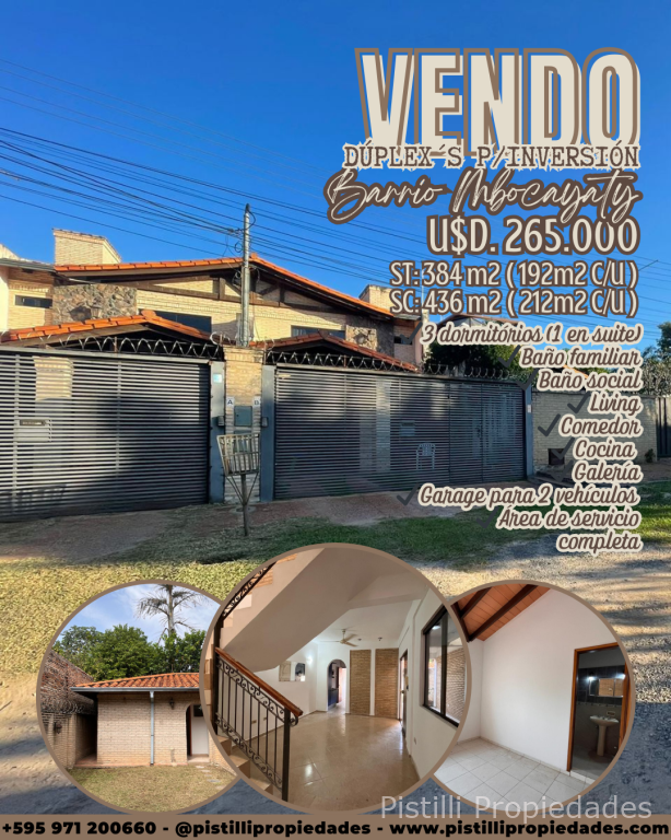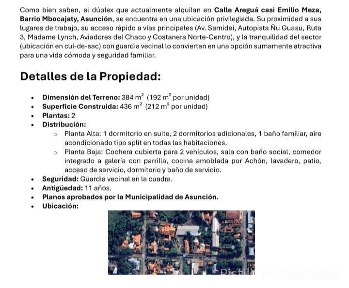 ¡Oportunidad Única para Inversionistas! Vendo Dos Dúplex en Barrio Mbocayaty ¡Descubrí la inversión perfecta en una de las zonas con mayor crecimiento de Asunción. Te presentamos dos hermosos y modernos dúplex, ideales para generar ingresos por alquiler o para que tu familia viva en uno y alquile el otro.