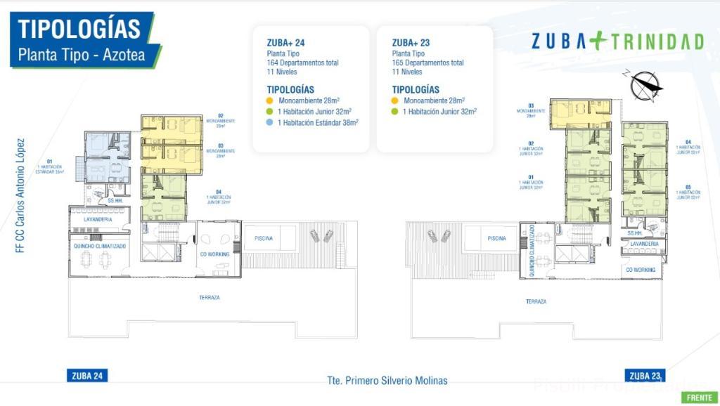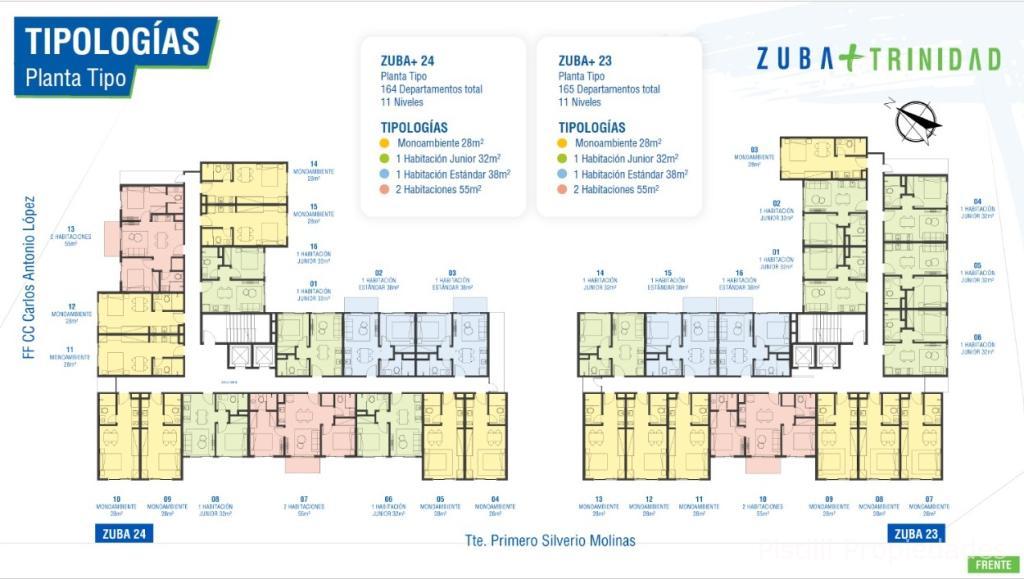 El edificio cuenta con Departamentos de tipología monoambiente, de una habitación Junior, estandar, plus y dos habitaciones, que se ajustan a las necesidades de los clientes potenciales.
