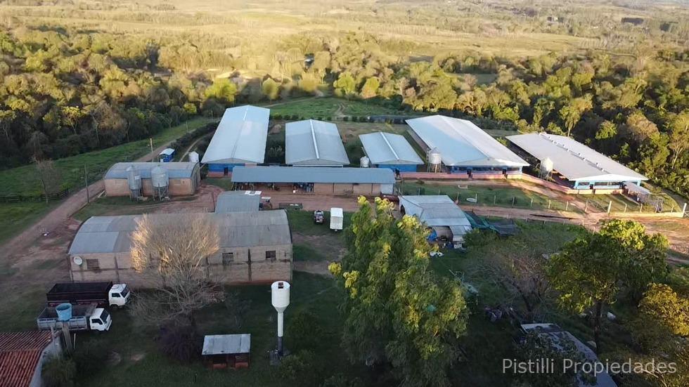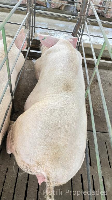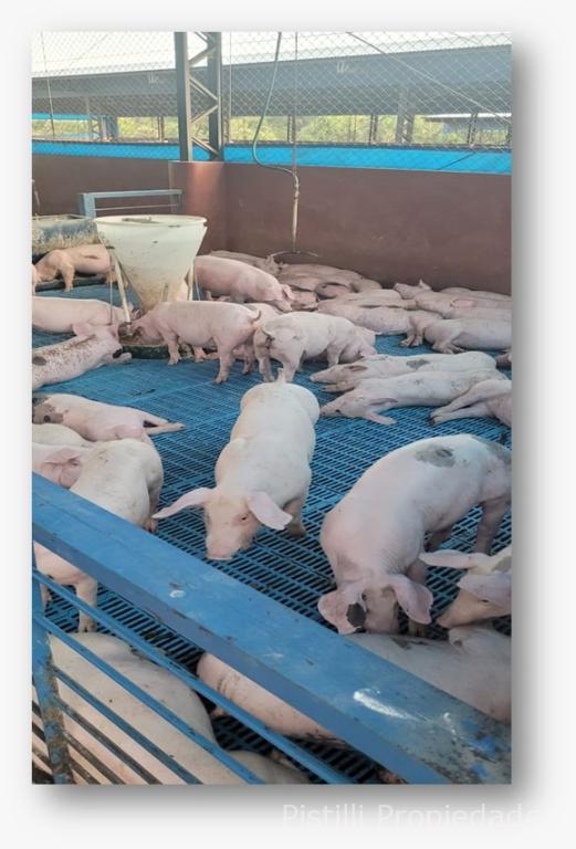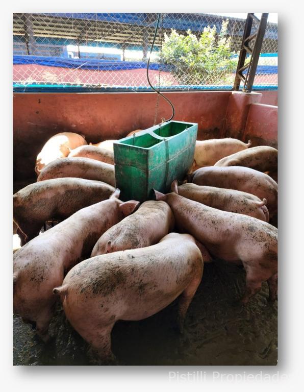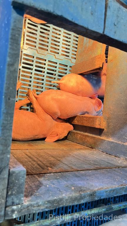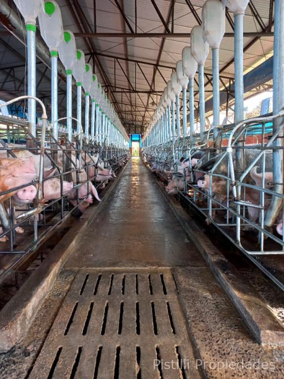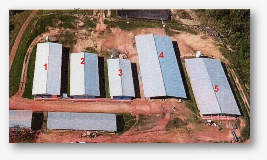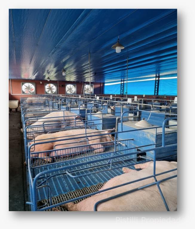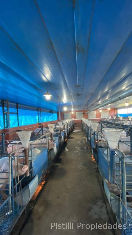 Galpón Nº 1 Gestación: Actualmente con 200 madres, con la ampliación ya realizada, la capacidad real alcanzaría seria de 300 reproductoras. Alimentación automatizada, calefacción, ventiladores y laboratorio para inseminación artificial con mesadas de granito natural, bachas de acero inoxidable, piso cerámico y revestimiento de azulejo; 4 boxes para reproductores, box para monta natural y box con maniquí para extracción de semen.